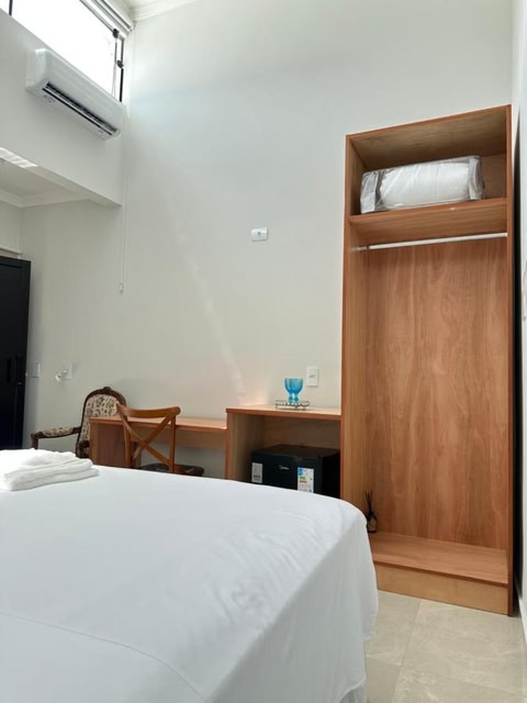 Bom e Barato rede de hotéis in Foz do Iguaçu offers comfortable hostel rooms with air-conditioning, private bathrooms, bidets, and walk-in showers. Each room includes a work desk, minibar, and wardrobe, ensuring a pleasant stay.